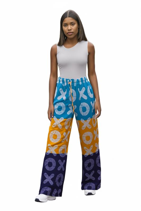 Make a statement in these playful XO Print Colorblock Pants, designed for the modern trendsetter who loves vibrant expression. Featuring a bold mix of sky blue and mustard yellow panels, these wide-leg pants bring instant energy to any outfit. The “XO” graphic print adds a fun, youthful twist, while the elastic waistband ensures all-day comfort and a perfect fit.
