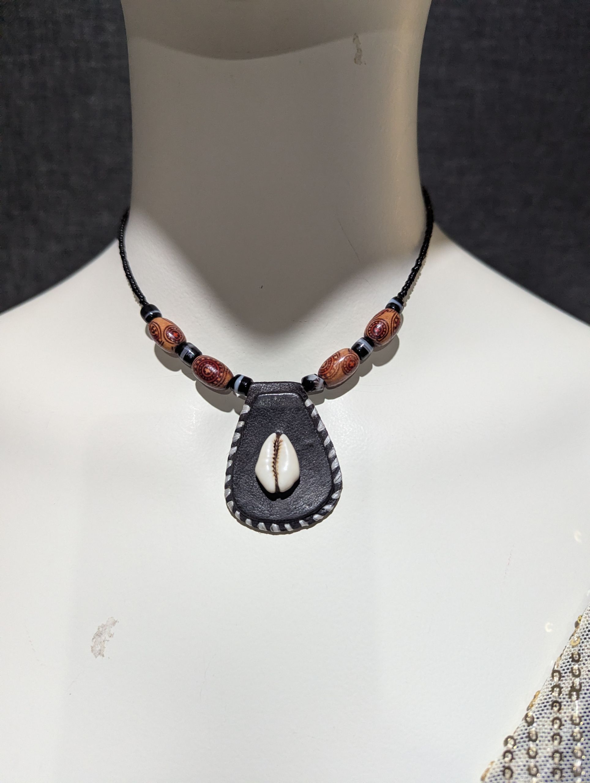 Elevate your style with this handcrafted African-inspired necklace featuring a striking single cowrie shell centerpiece. The pendant rests on a black leather teardrop base, accented with hand-stitched detailing for a touch of artistry. Richly patterned wooden beads and glossy black spacers complete the look, bringing together natural textures and cultural charm.