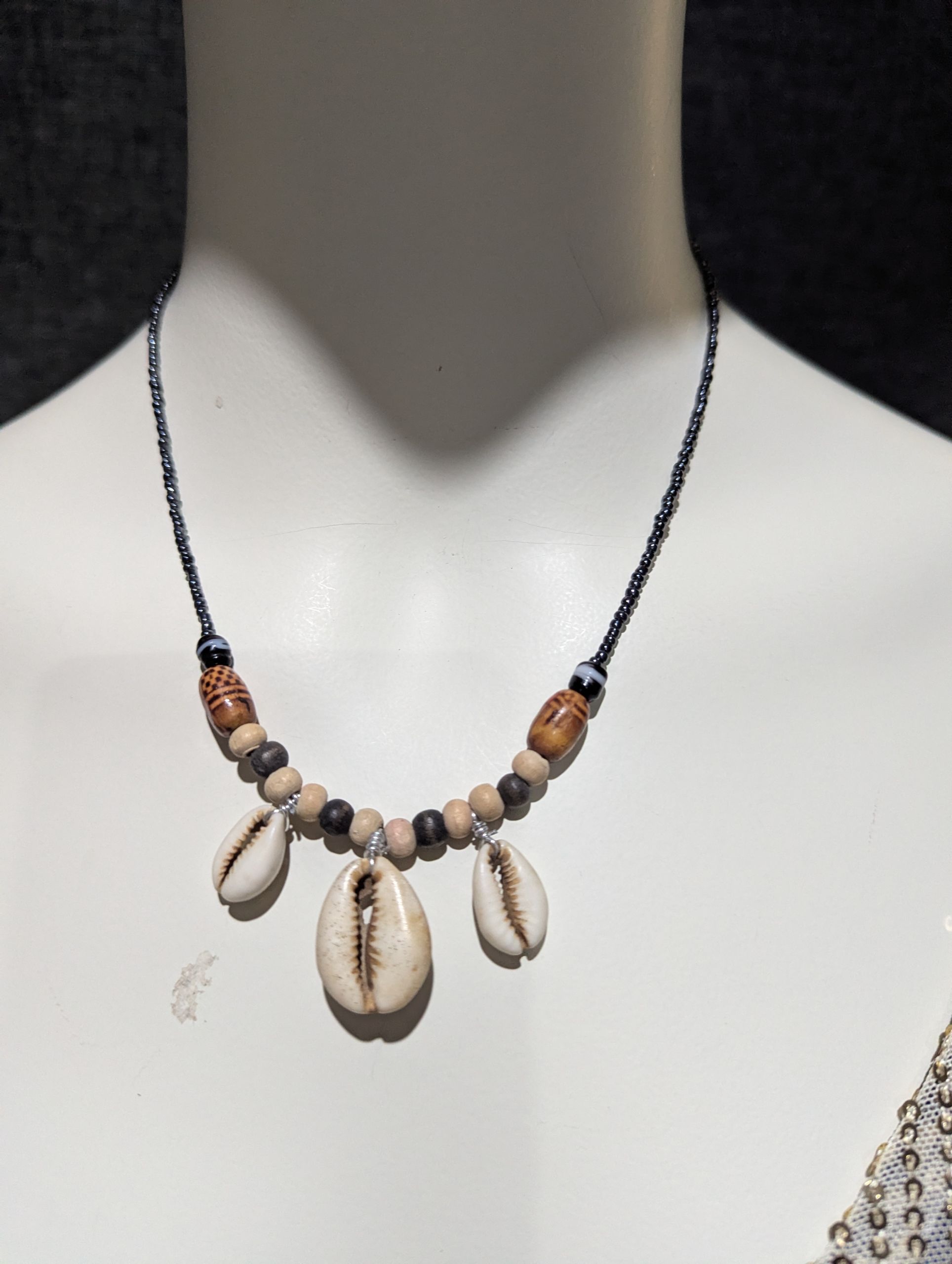 A necklace featuring a combination of small beads and cowrie shells, strung together on a delicate chain