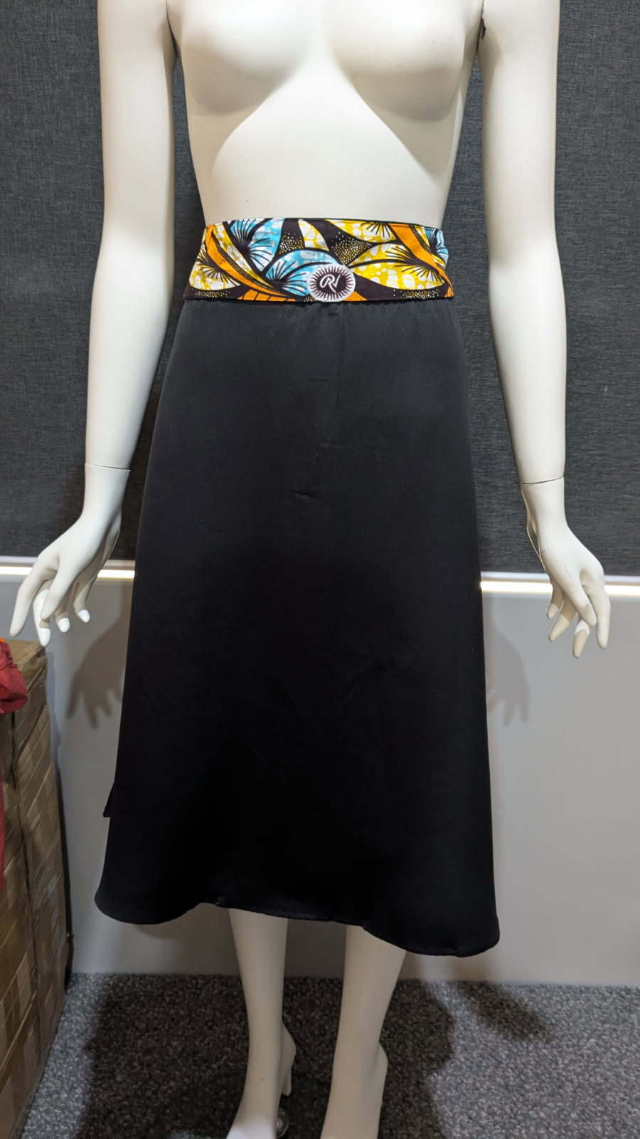 A classic black midi skirt elevated with a vibrant African-inspired waistband — where simplicity meets culture.