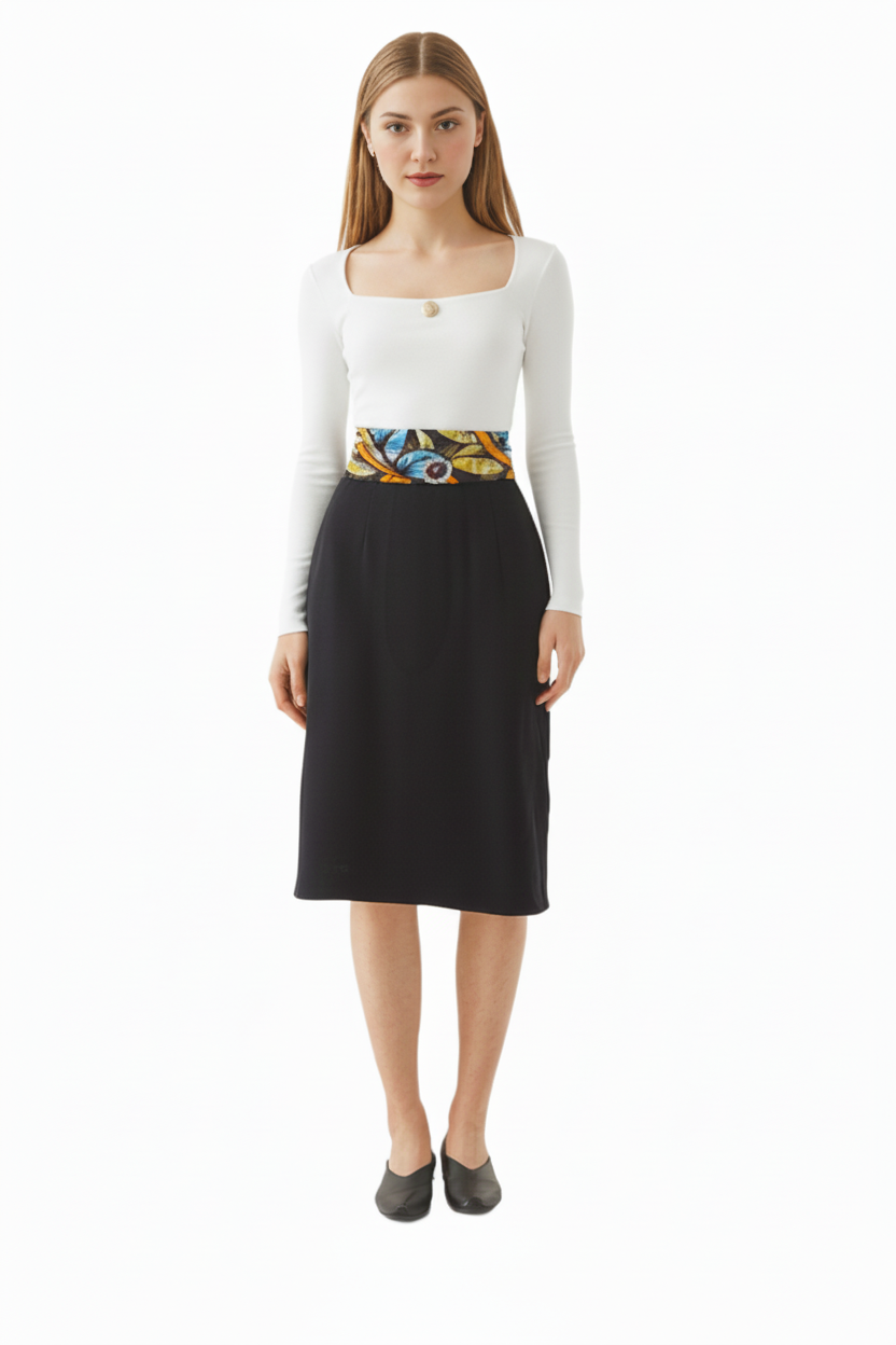 Black Midi Skirt with Ankara Waist Detail