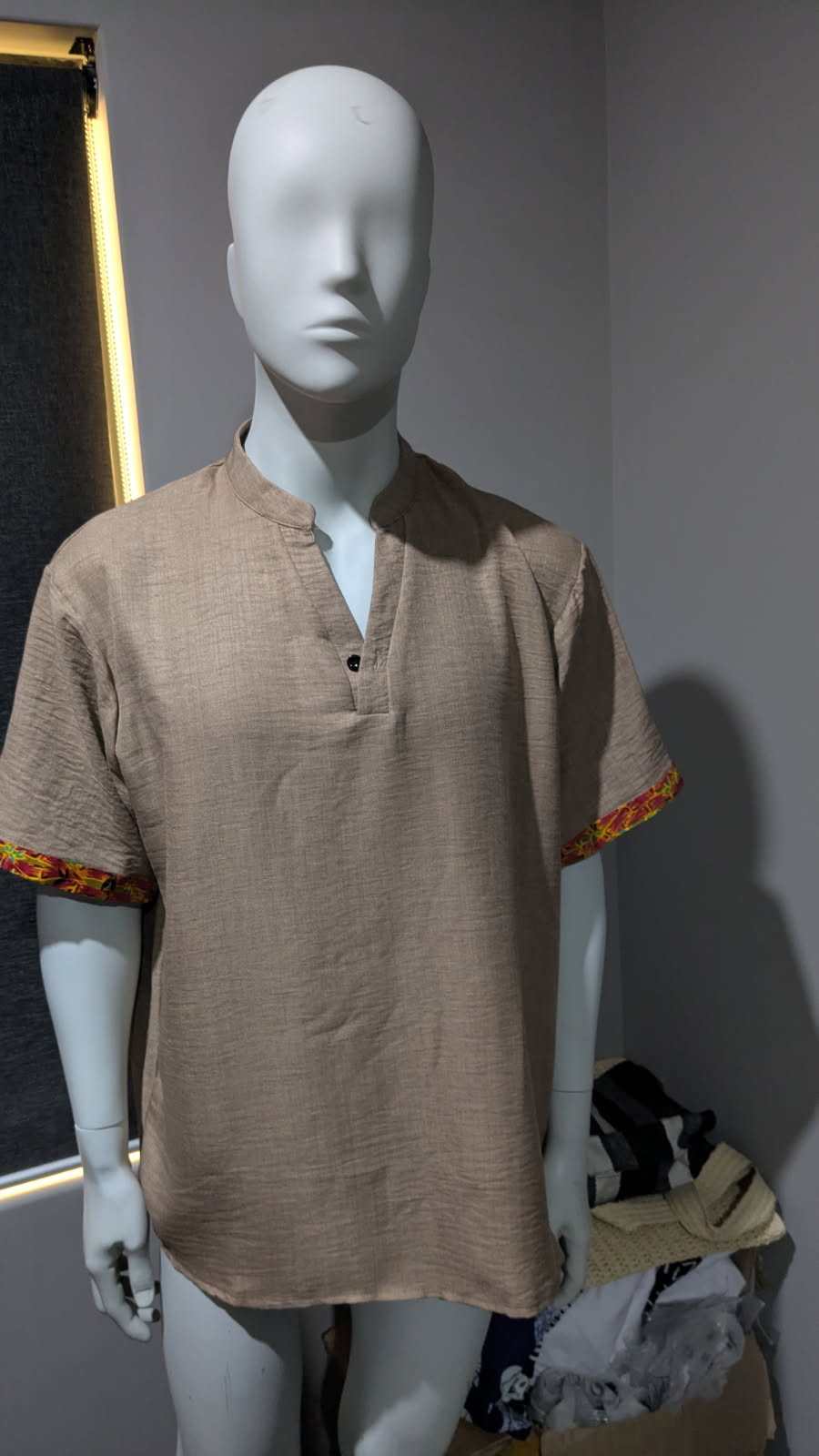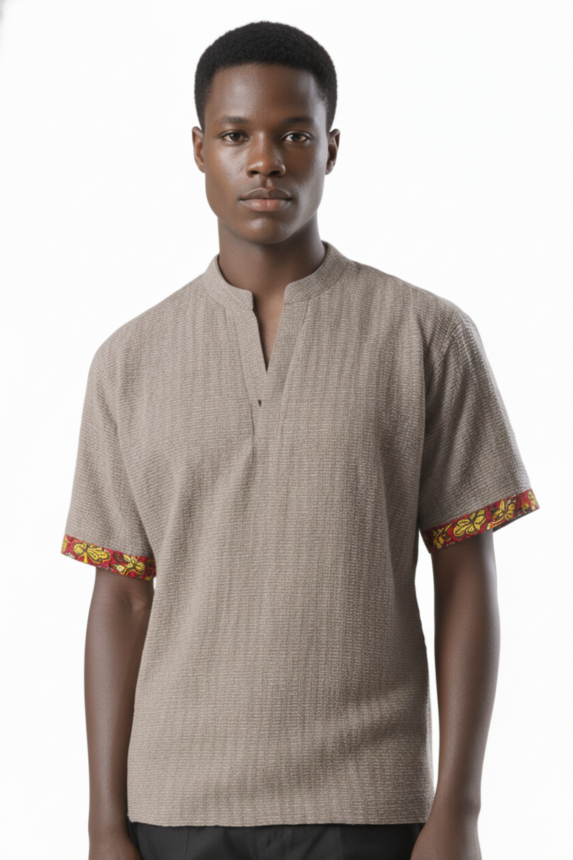 Elevate your casual style with this effortlessly stylish men’s short-sleeve shirt. Crafted from lightweight beige fabric, it features a relaxed fit and a sleek mandarin collar for a modern touch. The standout detail lies in the vibrant African print trim on the sleeve cuffs, adding a pop of culture and color to the minimalist design. Perfect for casual outings, cultural events, or weekend wear, this shirt blends comfort with contemporary African flair.