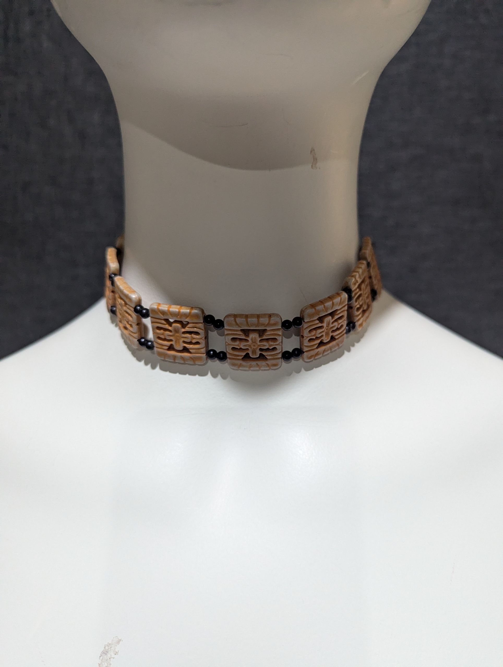 A choker necklace featuring a geometric bead design with alternating square and rectangular shapes