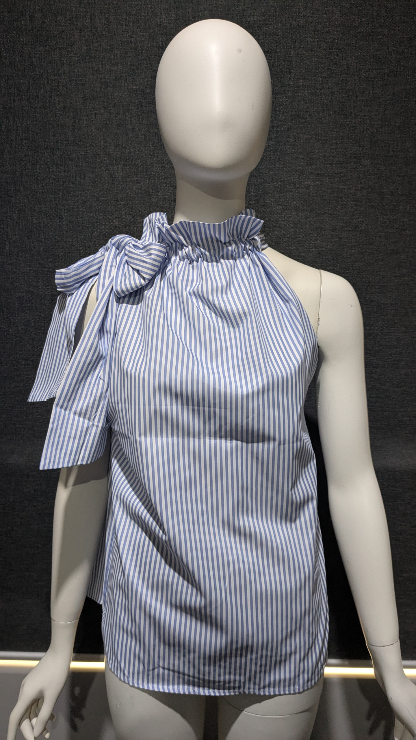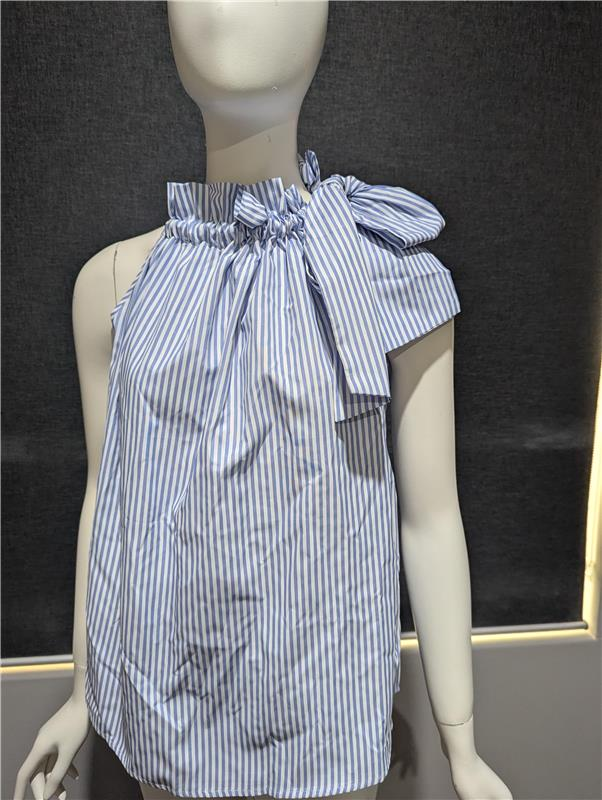 Add a touch of effortless elegance to your everyday style with this blue and white striped blouse. Designed with a playful ruffled high neckline and a chic bow-tie detail on one shoulder, this top blends classic tailoring with a feminine twist. The lightweight cotton fabric ensures breathability and comfort, making it perfect for warm-weather days or layering under a blazer for a polished look.